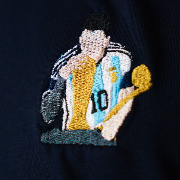 Kimisi için G.O.A.T, kimisi için Uzaylı, kimisi için dünyanın en iyisi. 2022 Dünya Kupasını Müzesine götürerek kupa koleksiyonunu tamamlayan Arjantinli Süperstar Messi’nin Dünya Kupası ile buluştuğu anı 16.000 iğne darbesi ile beyaz ve lacivert renk, %100 pamuk, yumuşacık tshirte işledik.